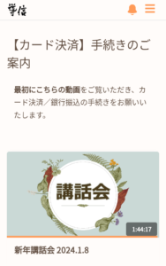 ◎ログイン⇒プレイリスト⇒【カード決済】手続きのご案内をクリック⇒新春講話会2024.1.8をクリック